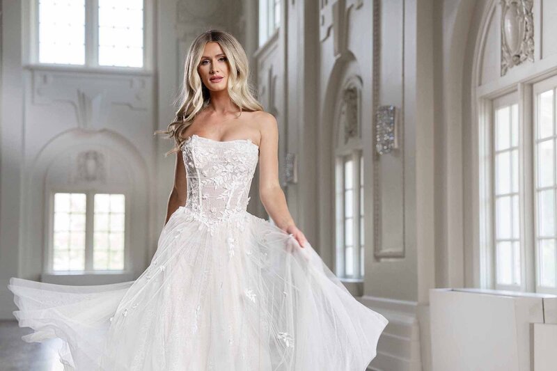 “Avelle is pure romance with just the right touch of drama. She’s light, airy, and totally ethereal — like stepping straight out of a modern fairytale. She’s a strapless A-line with exposed boning, ruching, and those beautiful floral appliqués that give her so much texture and movement. The slight basque waist shapes and elongates you beautifully, and the bodice sculpts you in all the right places while still feeling soft and delicate. The tulle skirt flows effortlessly, giving you that dreamy, floaty movement with every step. And the floral appliqués on the bodice? Total showstopper. They trail softly into the skirt, almost like they’re growing right out of it — so romantic.