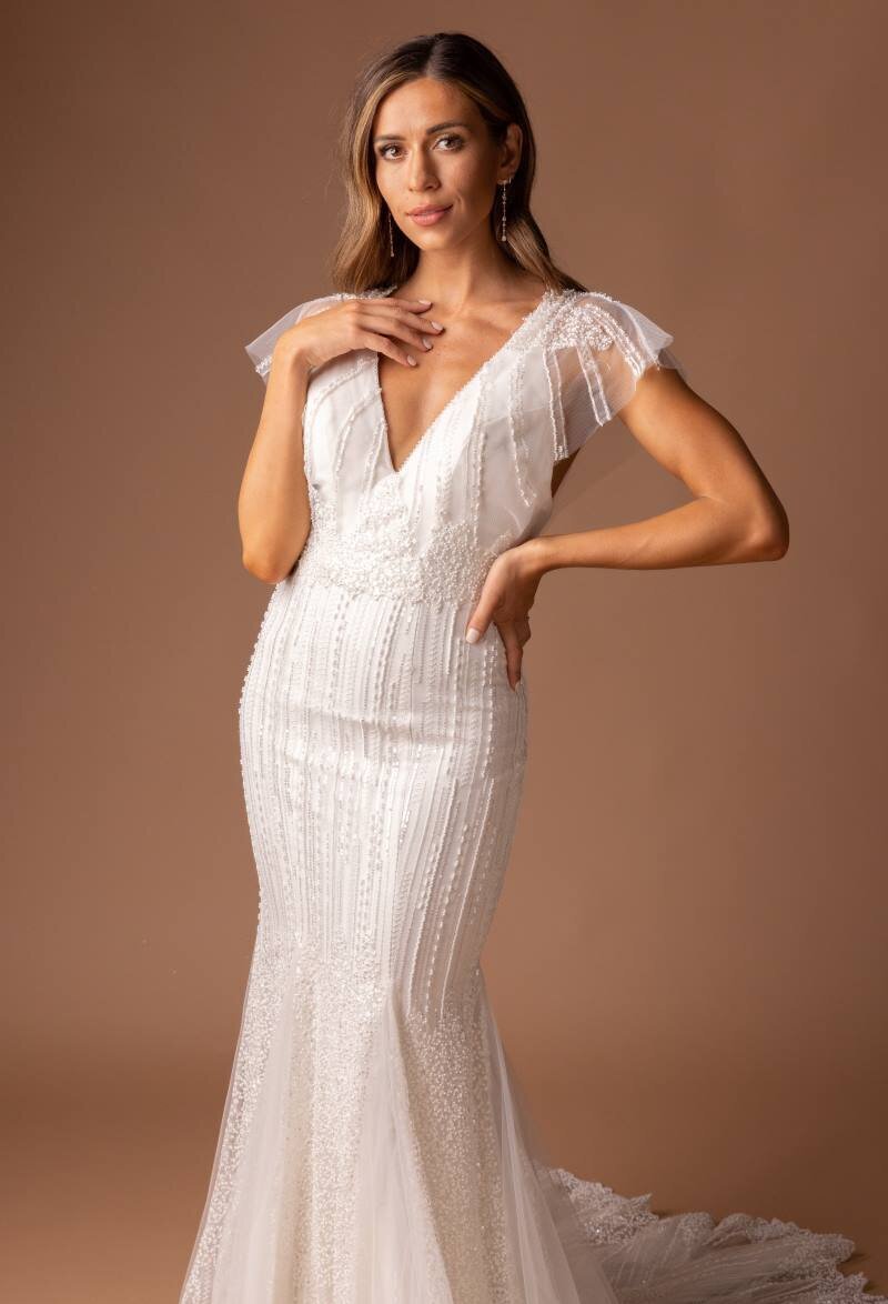 She has a sleek sheath silhouette that hugs just right, but what really makes her special is the beadwork. Covered in delicate white and iridescent beading, Cora catches the light from every angle—it’s like wearing a soft shimmer.