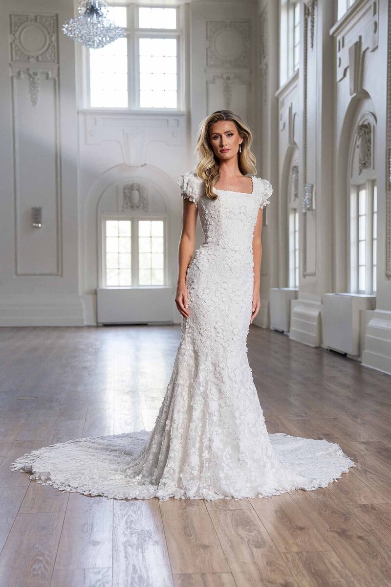 “Fiori has truly stolen hearts, and this fitted version is just as swoon-worthy, with a little extra edge. The soft, 3D floral lace covers the entire gown, adding that dreamy, dimensional texture that looks stunning from every angle.
