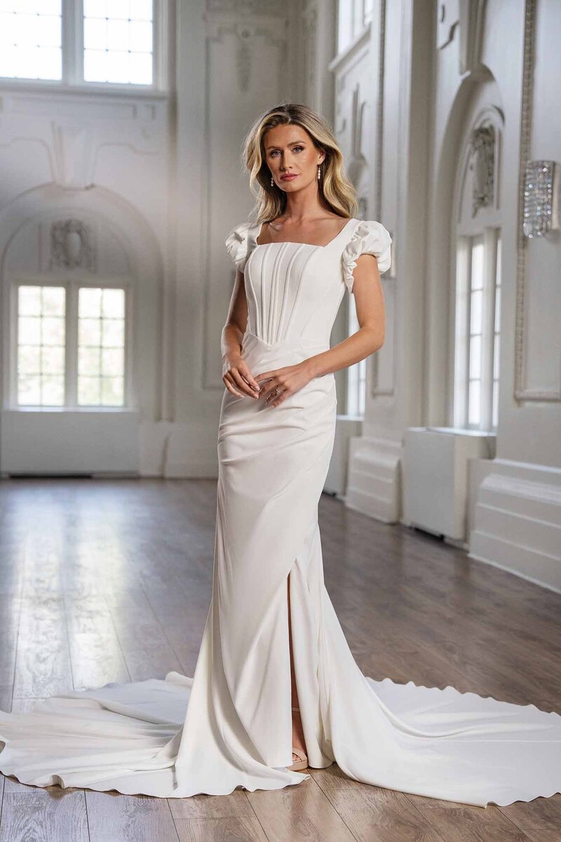 “Raffiné III’s puff sleeve version is all about clean lines with a fun, romantic twist. The structured corset bodice with exposed boning shapes and supports beautifully, while the square neckline feels modern and classic all at once.
