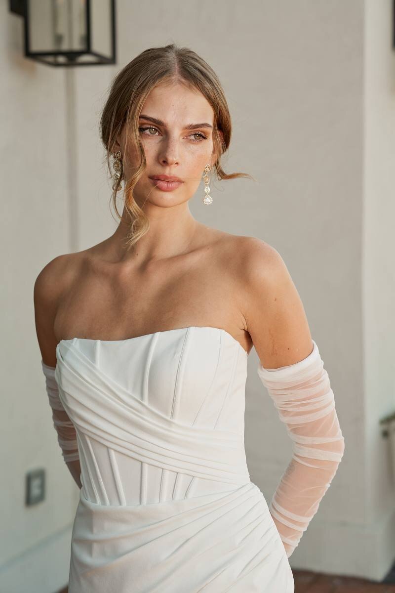 “Sourire is bold, modern, and a little bit playful — just like you! This sleek crepe mini hugs your shape but still lets you move freely. The wrap crossover skirt adds a touch of drama, and those exposed boning details bring some cool edge. Plus, the detachable ruched mesh sleeves? Total game-changer. Wear ’em for a romantic vibe or take them off to keep it sleek and chic. Sourire is perfect if you want to stand out and shine your way.”